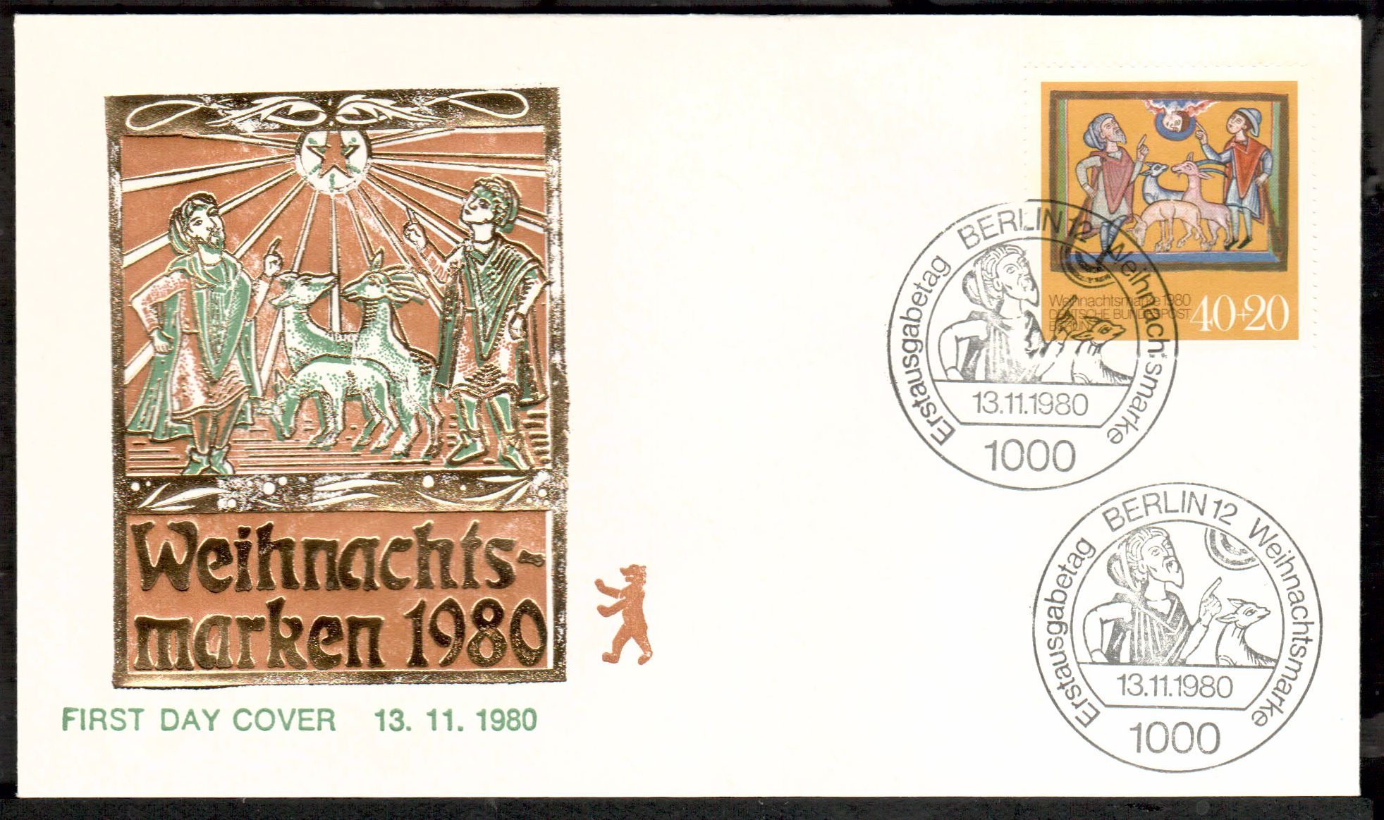 Sie bieten auf einwandfreie Ersttagsbriefe von Berlin.Sie erhalten den FDC , den Sie im Bild sehen, alles verschiedene im Hinblick auf Gestaltung des Schmuckumschlags,echt gelaufen,Einzelfdcs oder zusammengefasste.Der Ordnung halber erwaehnen wir, das Gebrauchsspuren auftreten koennen.