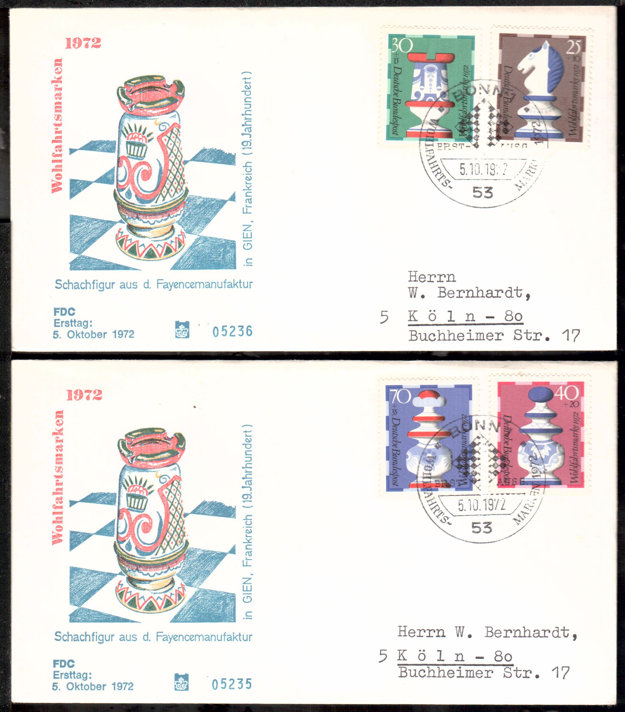 Sie bieten auf einwandfreie Ersttagsbriefe der Bundesrepublik.Sie erhalten den FDC , den Sie im Bild sehen, alles verschiedene im Hinblick auf Gestaltung des Schmuckumschlags,echt gelaufen,Einzelfdcs oder zusammengefasste.Der Ordnung halber erwaehnen wir, das Gebrauchsspuren auftreten koennen.