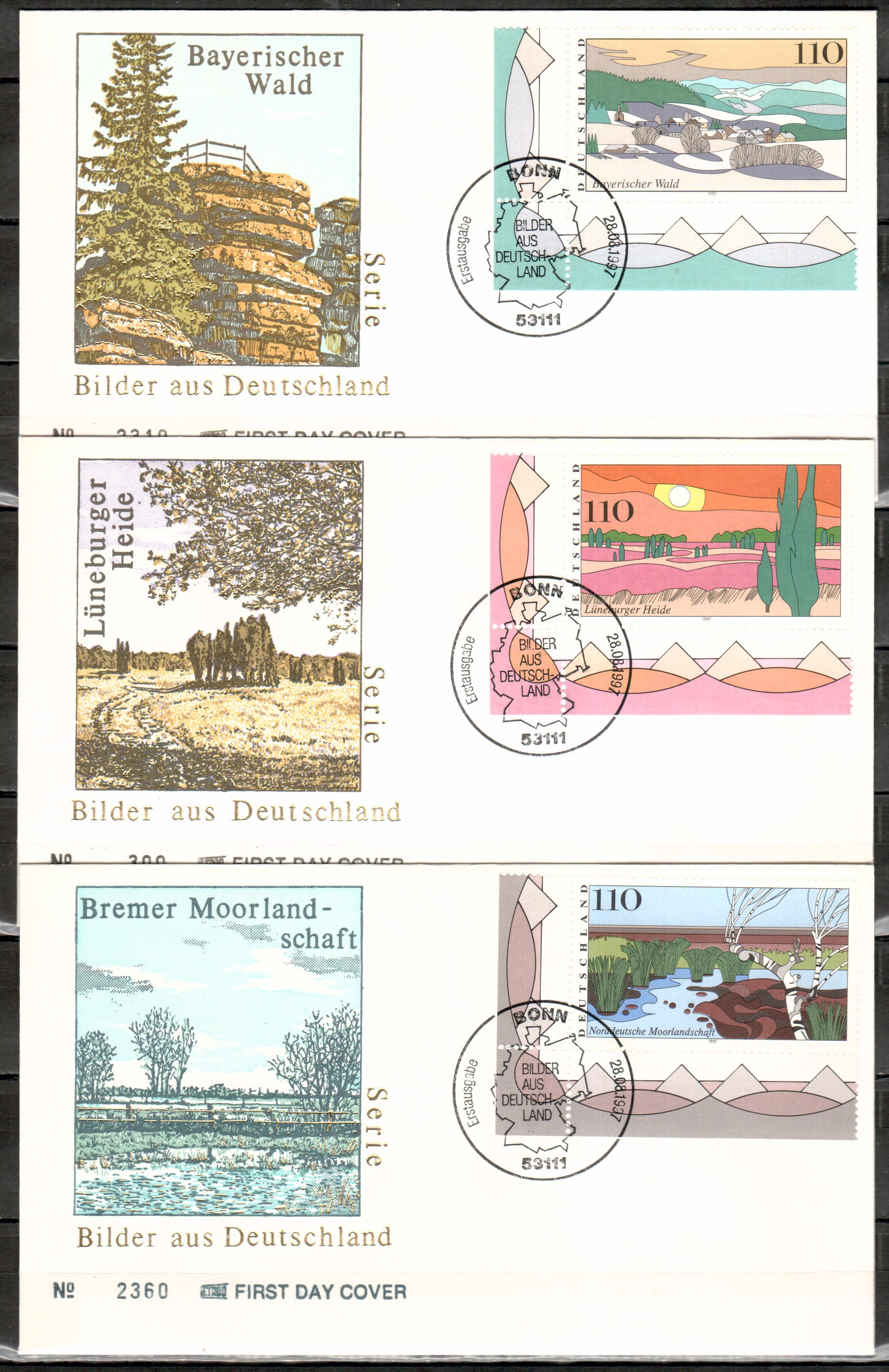 Sie bieten auf einwandfreie Ersttagsbriefe der Bundesrepublik.Sie erhalten den FDC , den Sie im Bild sehen, alles verschiedene im Hinblick auf Gestaltung des Schmuckumschlags,echt gelaufen,Einzelfdcs oder zusammengefasste.Der Ordnung halber erwaehnen wir, das Gebrauchsspuren auftreten koennen.