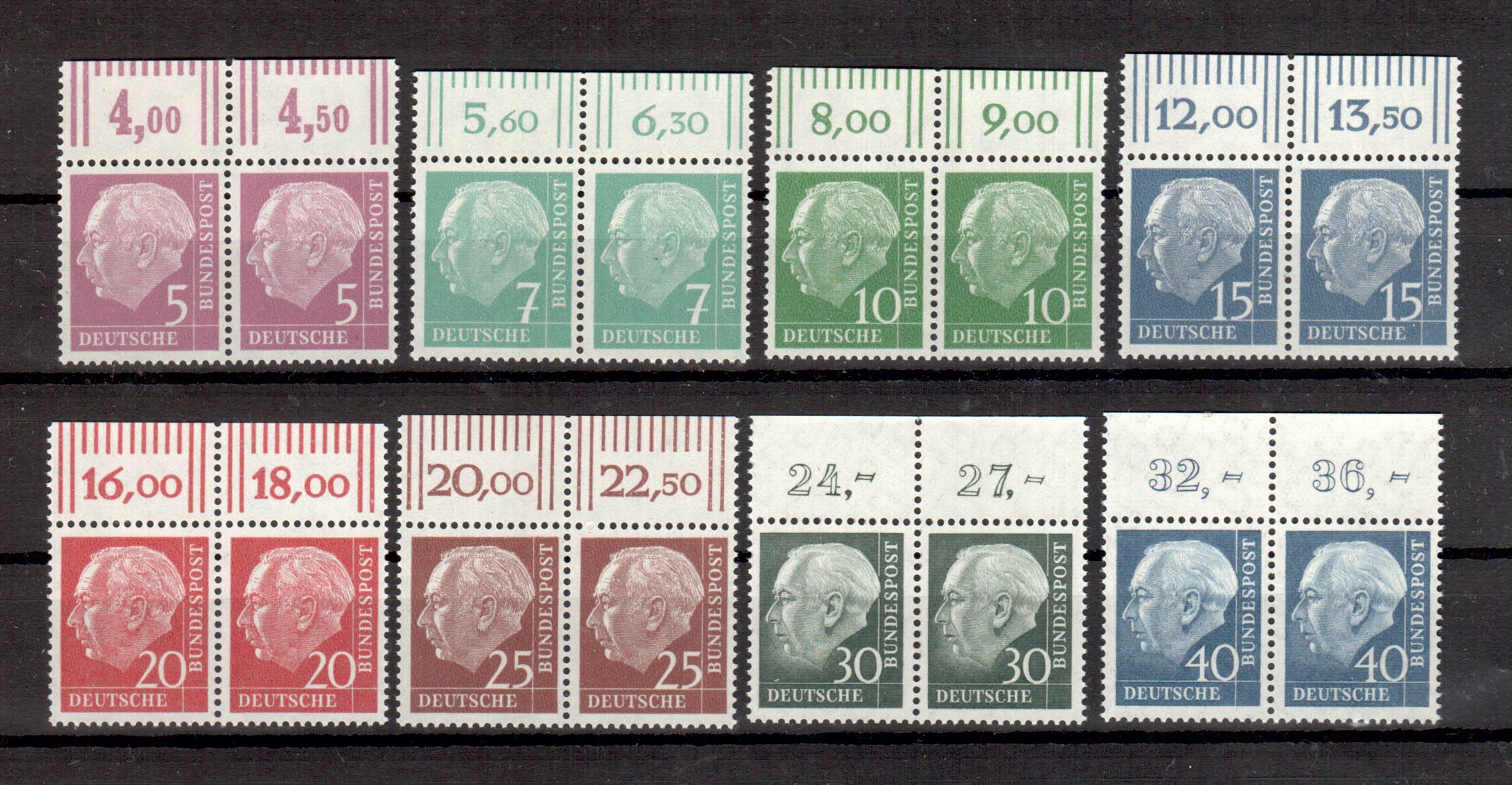 Art.Nr.: BRD Michelnummer 179,181,183-186,259,260 y Heuss lumogen waagerechte Paare postfrisch